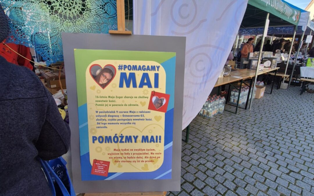 28 września na oławskim Rynku, w ramach Oławskiej Niedzieli Przedsiębiorczości, odbyła się uroczysta akcja charytatywna pod hasłem „Pomagamy Mai Zegar” – naszej koleżance z klasy 2GP, która zmaga się z chorobą nowotworową. Po wcześniejszej, niezwykle udanej sprzedaży ciast na terenie szkoły, dzięki której udało się zebrać imponującą kwotę 9 070 zł, przygotowaliśmy własne stoisko z rękodziełem wykonanym przez uczniów, nauczycieli oraz przyjaciół szkoły.