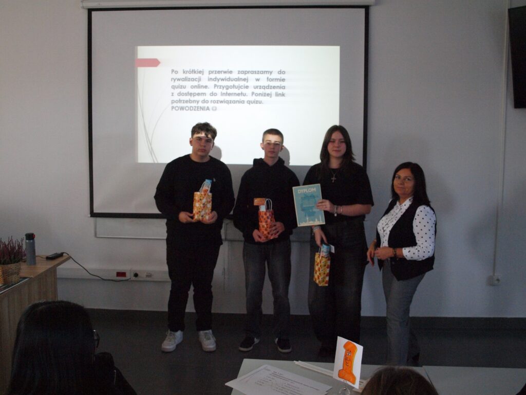 Drużynowo I miejsce zajęli: Aleksandra Wicher, Wiktor Tyrpa i Sebastian Wartownik z klasy 1RM.