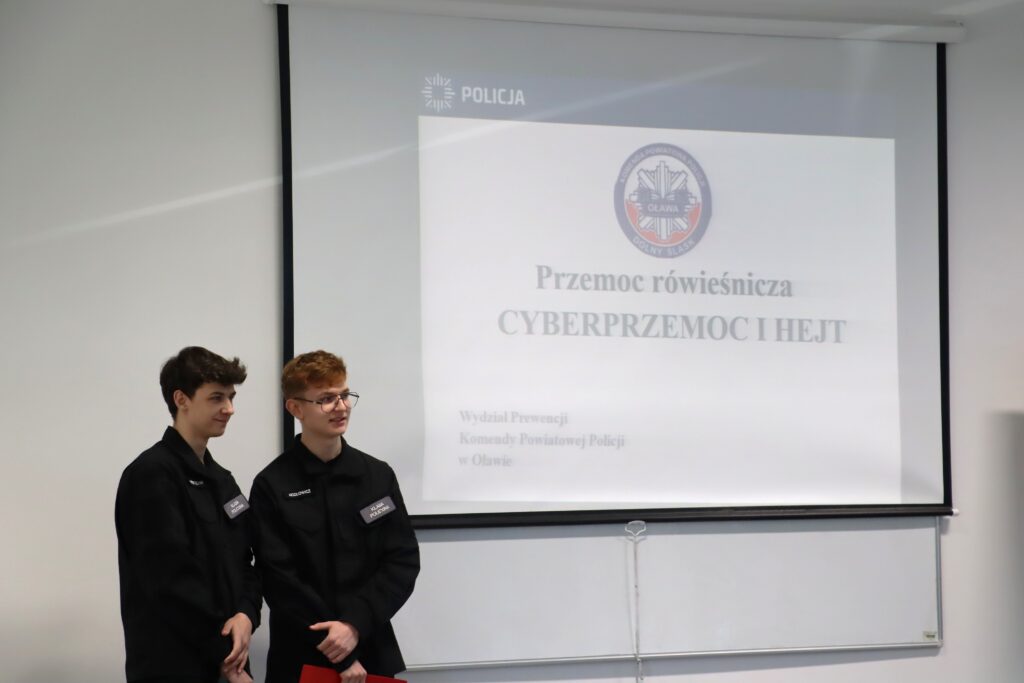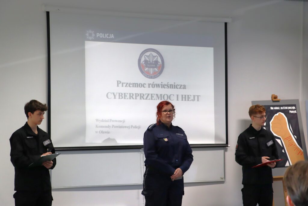 Podczas spotkania uczniowie z klasy 2 liceum o profilu policyjnym zaprezentowali przygotowaną wspólnie z wydziałem Prewencji prezentację dotyczącą hejtu, agresji oraz różnych form przemocy, a przede wszystkim ich konsekwencji prawnych i społecznych.