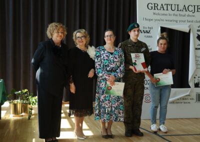 Dyrektor szkoły, pani Maria Domaradzka wręczyła maturzystom świadectwa z wyróżnieniem, nagrody, dyplomy gratulując im wybitnych wyników w nauce i sporcie oraz dziękując za działalność w Samorządzie Uczniowskim i zaangażowanie w życie szkoły, a rodzicom listy gratulacyjne oraz podziękowania za zaangażowanie i nieocenione wsparcie w organizacji życia szkoły.